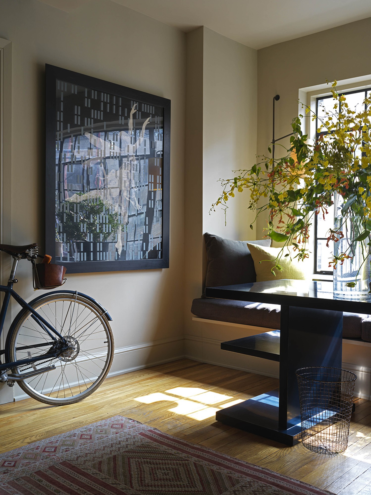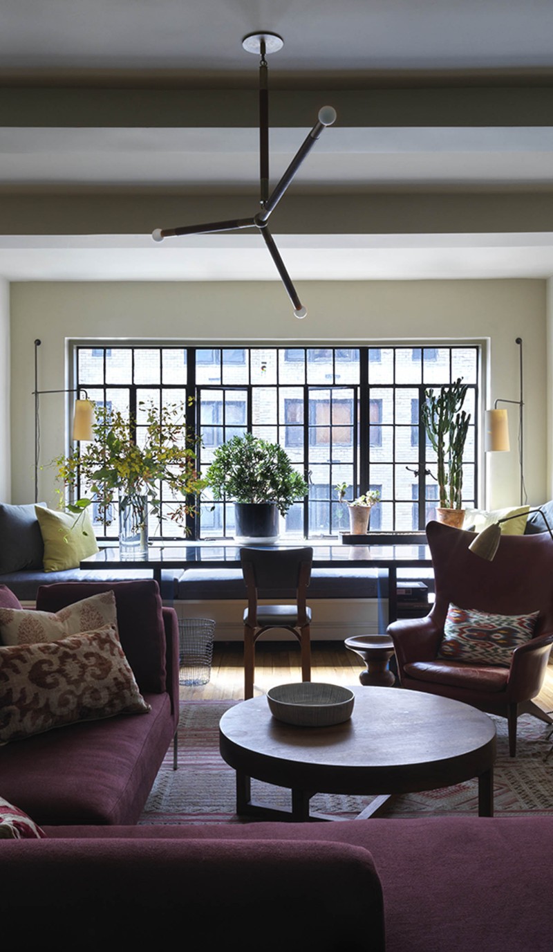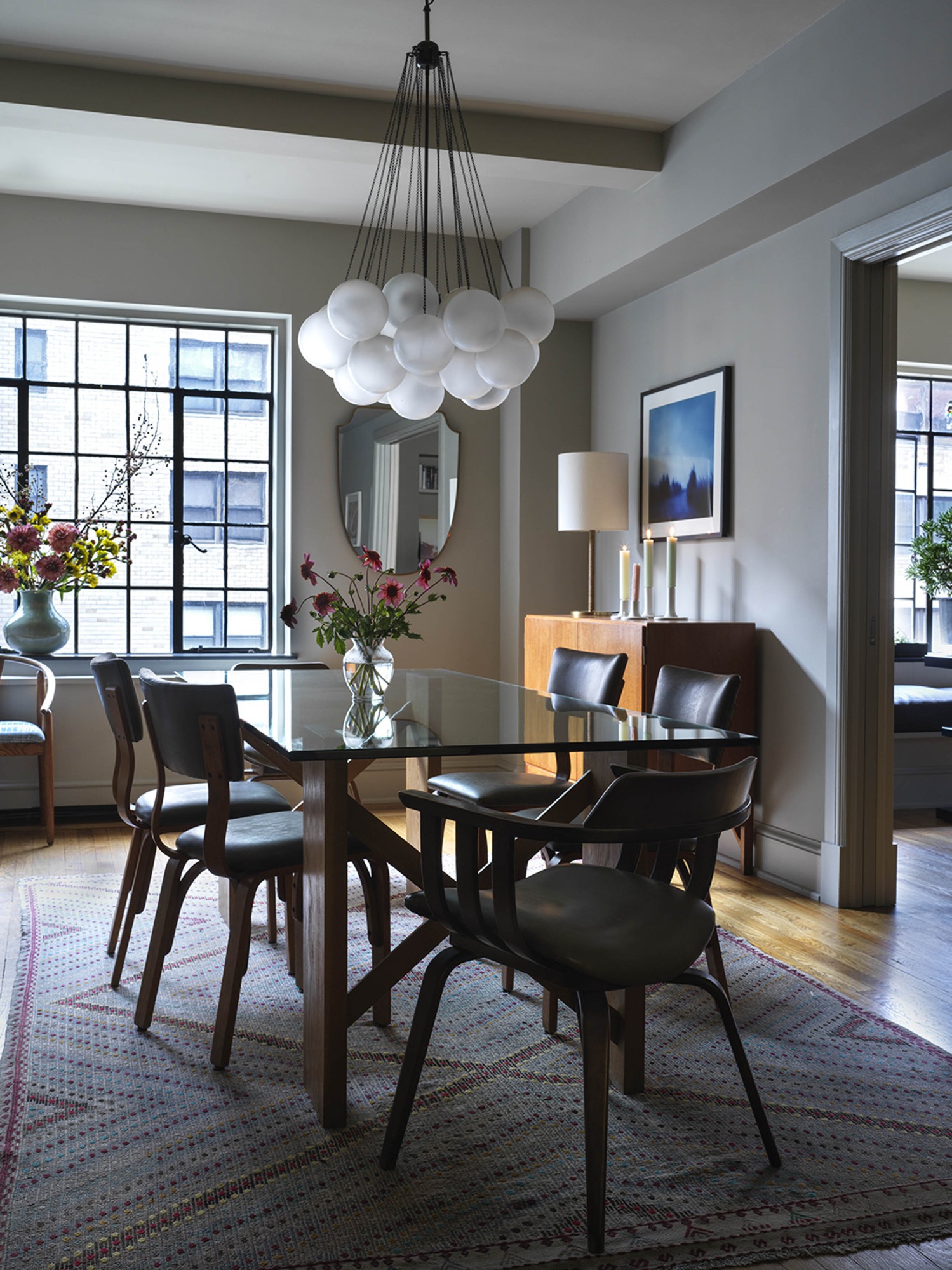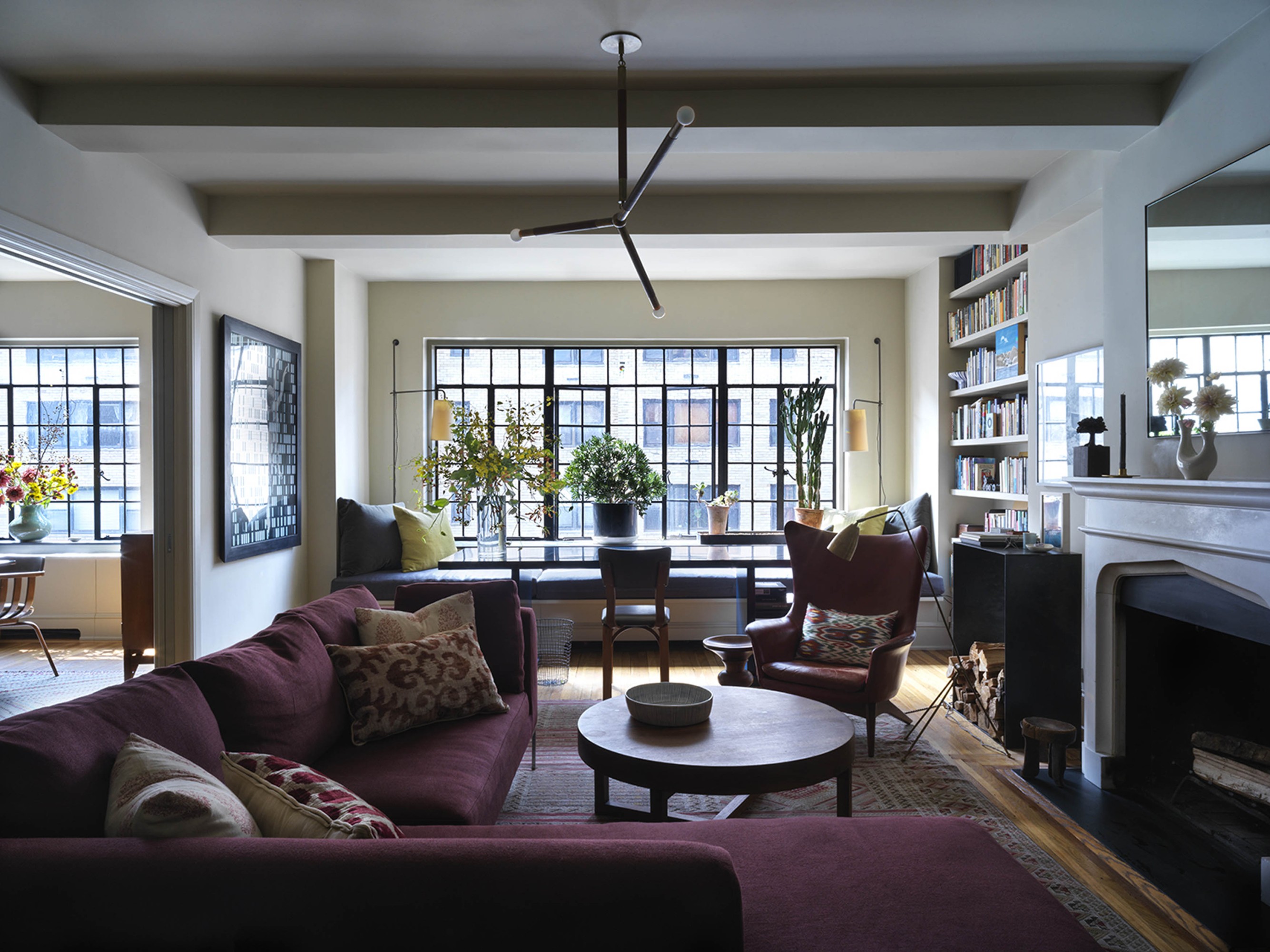 We were invited to transform a classic prewar apartment into a stylish but unfussy family home. The interior palette varies as dark, smaller spaces flow into progressively light, larger rooms. This subtle transition of color makes the larger rooms, although low-ceilinged, feel even more spacious and bright. The use of velvety warm grays and ivory colors is accentuated by an ensemble of antiques, mid-century modern, and contemporary pieces. The clients’ art collection and family heirlooms bring depth and history to this eclectic mix.