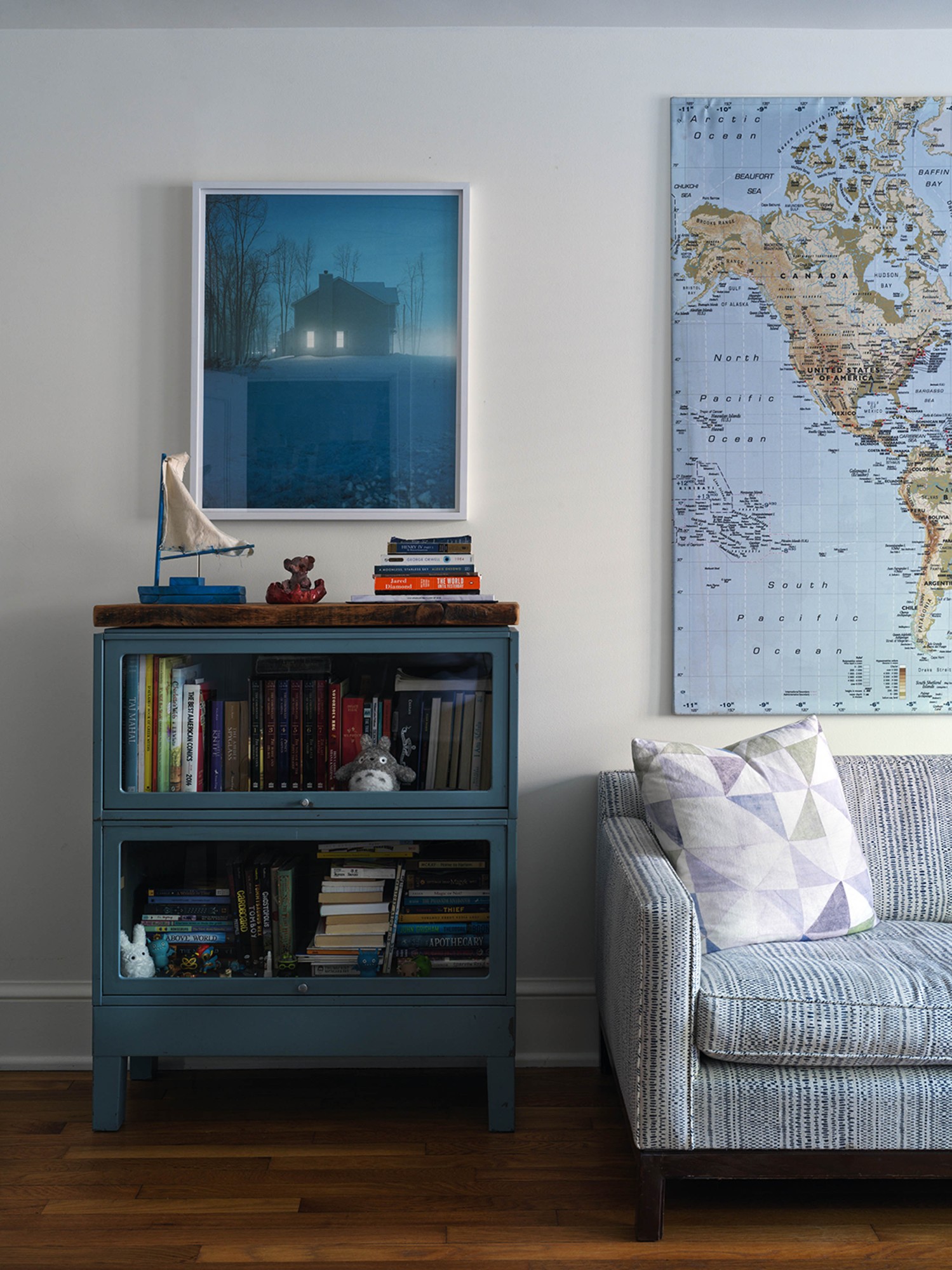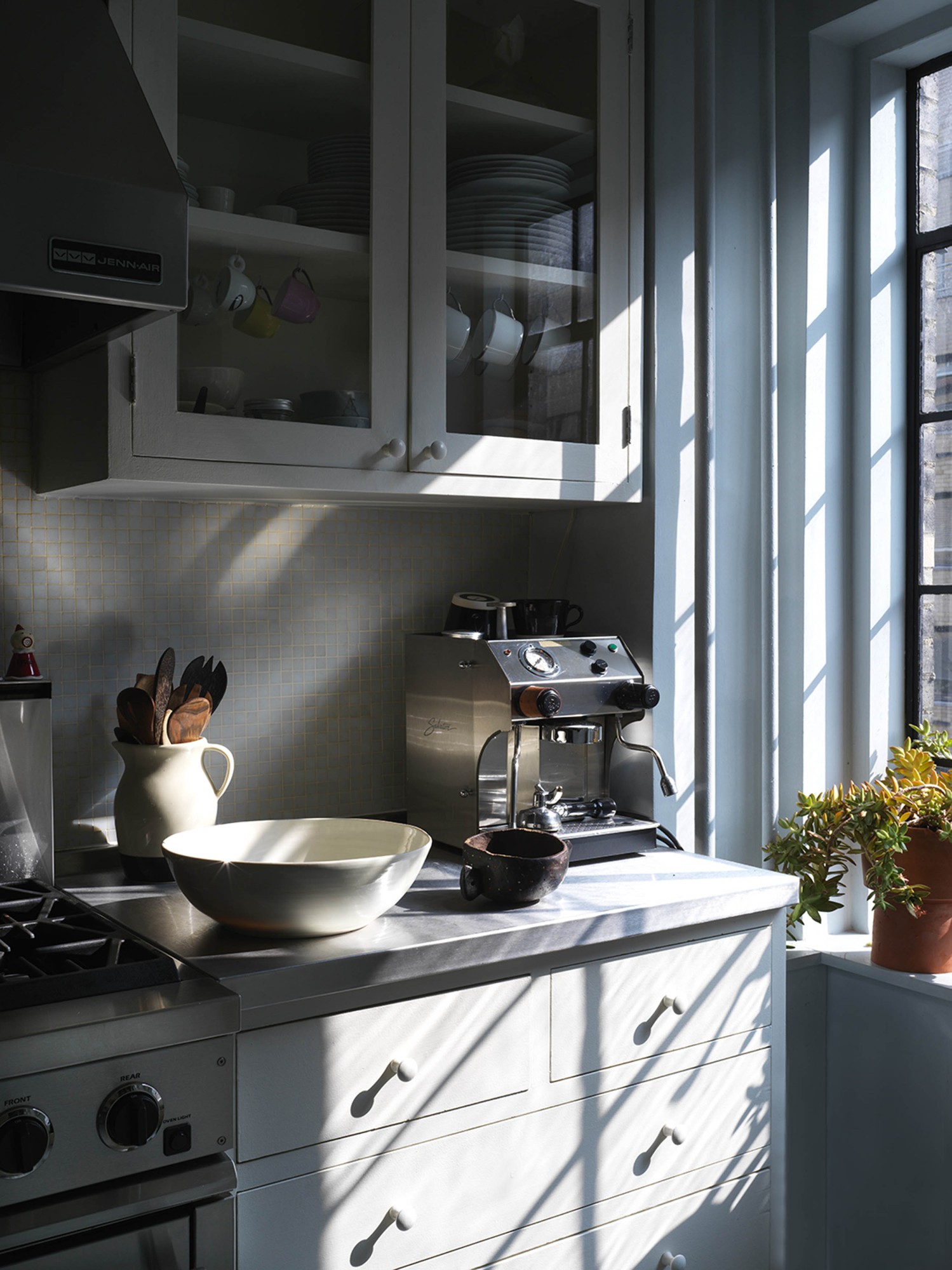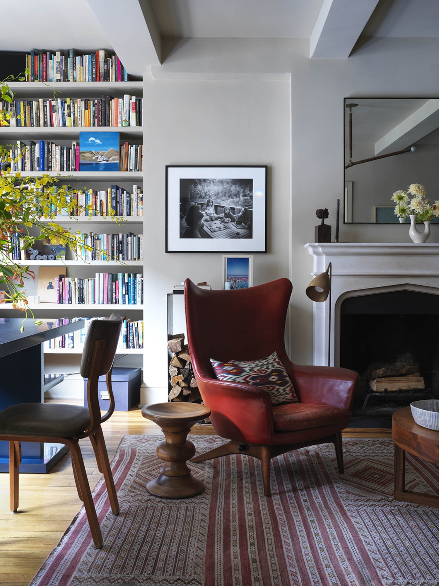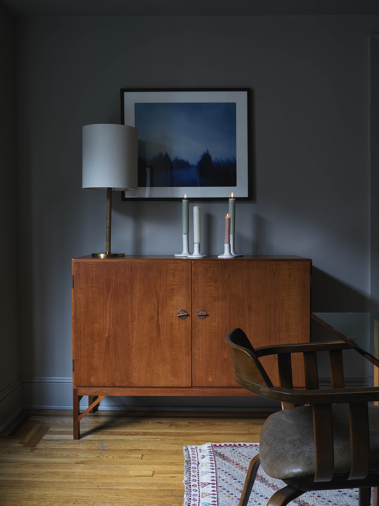 We were invited to transform a classic prewar apartment into a stylish but unfussy family home. The interior palette varies as dark, smaller spaces flow into progressively light, larger rooms. This subtle transition of color makes the larger rooms, although low-ceilinged, feel even more spacious and bright. The use of velvety warm grays and ivory colors is accentuated by an ensemble of antiques, mid-century modern, and contemporary pieces. The clients’ art collection and family heirlooms bring depth and history to this eclectic mix.